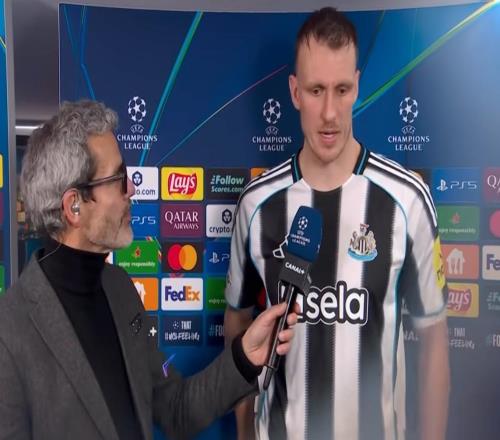 欧冠联赛阶段第8轮,纽卡客场1-1战平巴黎,纽卡后卫丹-伯恩赛后接受了CANAL+的采访。丹,恭喜你们取得这个结果并...